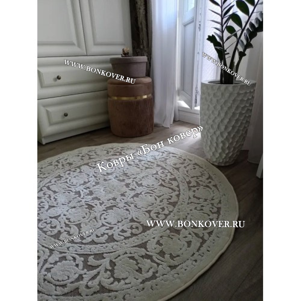 Шикарный Круглый Белый Шелковистый Ковер Дизайн 30542 наполняет интерьер гостиной теплом и уютом, гармонично сочетает в себе изящество и стиль. Он изготовлен из современных материалов, комфортный и долговечный.
